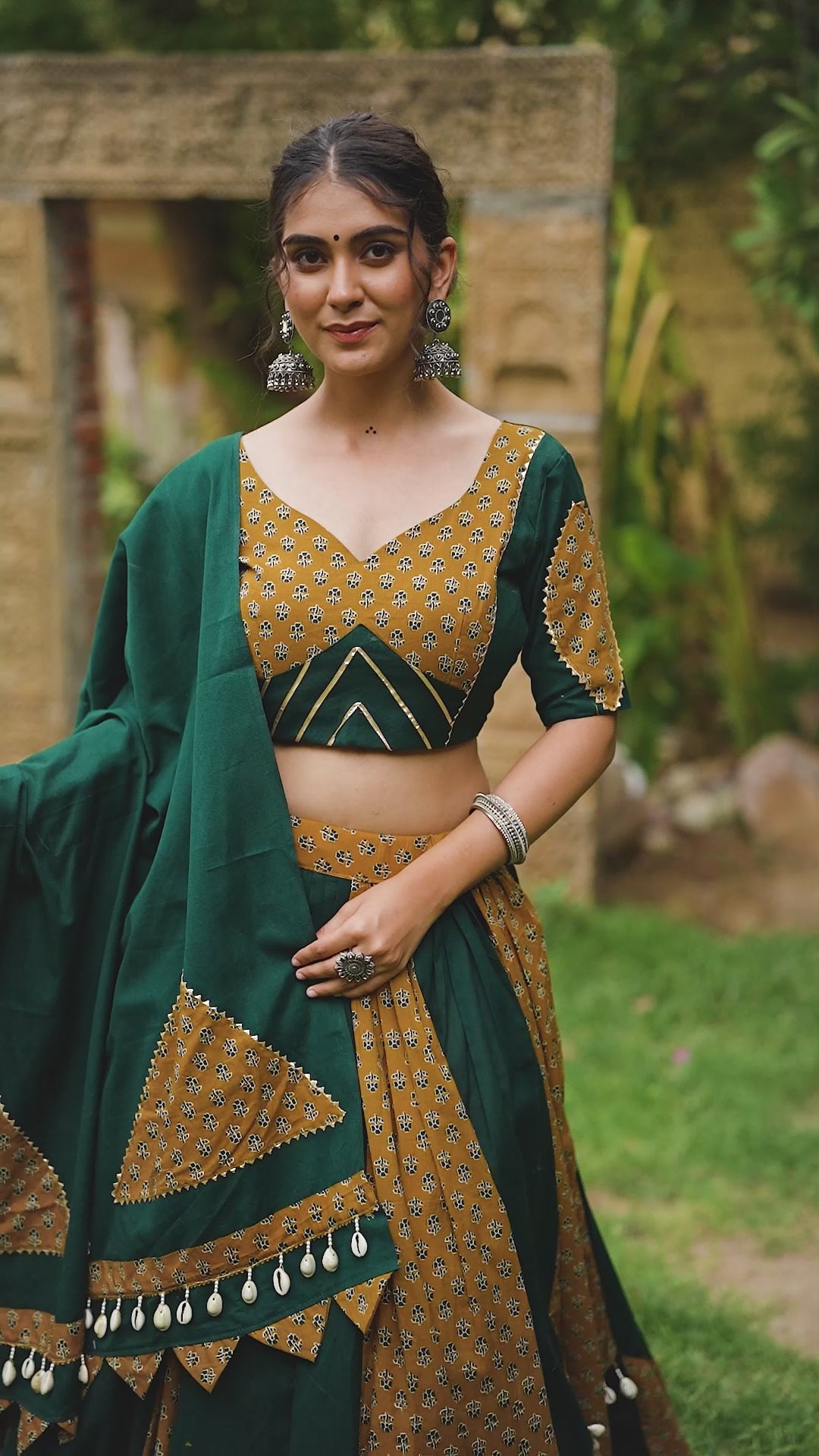 Step into the Festive Season with a Mustard & Green Cotton Chaniya Choli: Plain with Printed Kali and Beautiful Cowrie (Kodi) Work – Embrace the Joy and Elegance of Navratri! 🦚