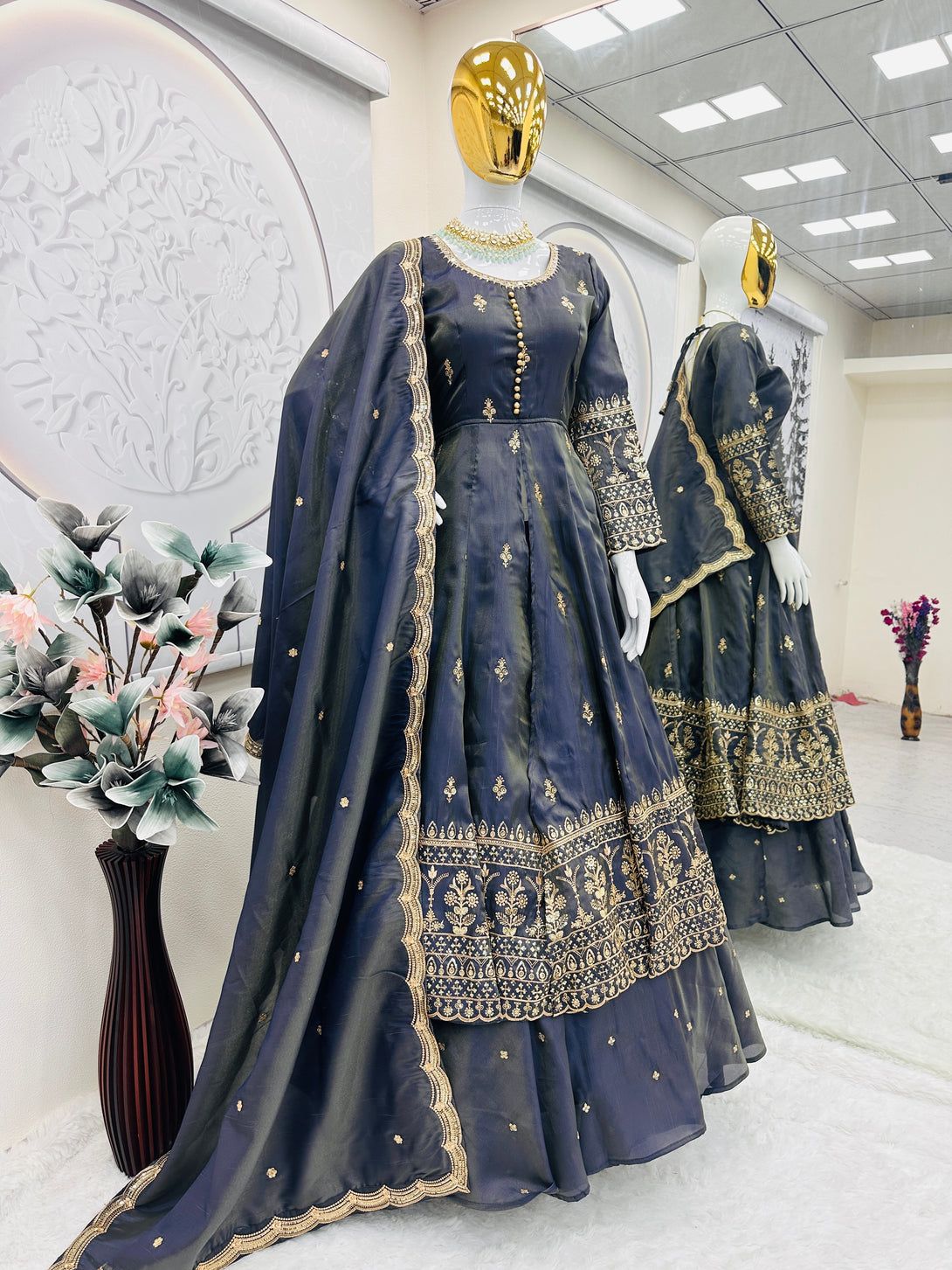 Heavy Shimmer Silk Gown Set with 4.5m Flair Lehenga & Embroidered Dupatta