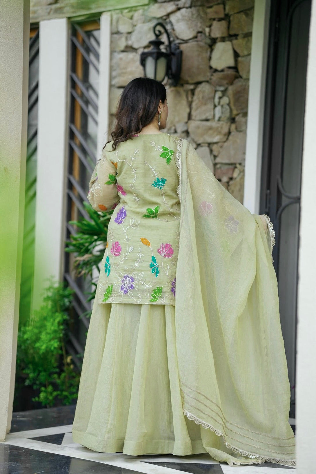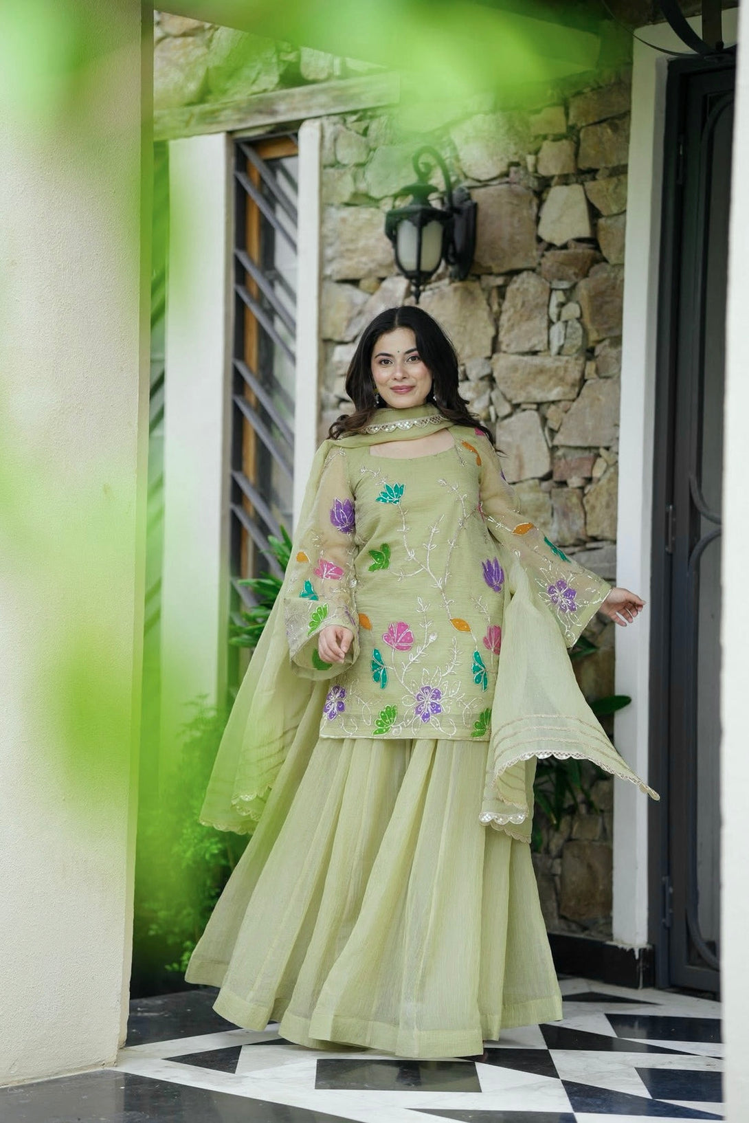 Pastel Green Floral Embroidered Sharara Set with Scallop Detailing
