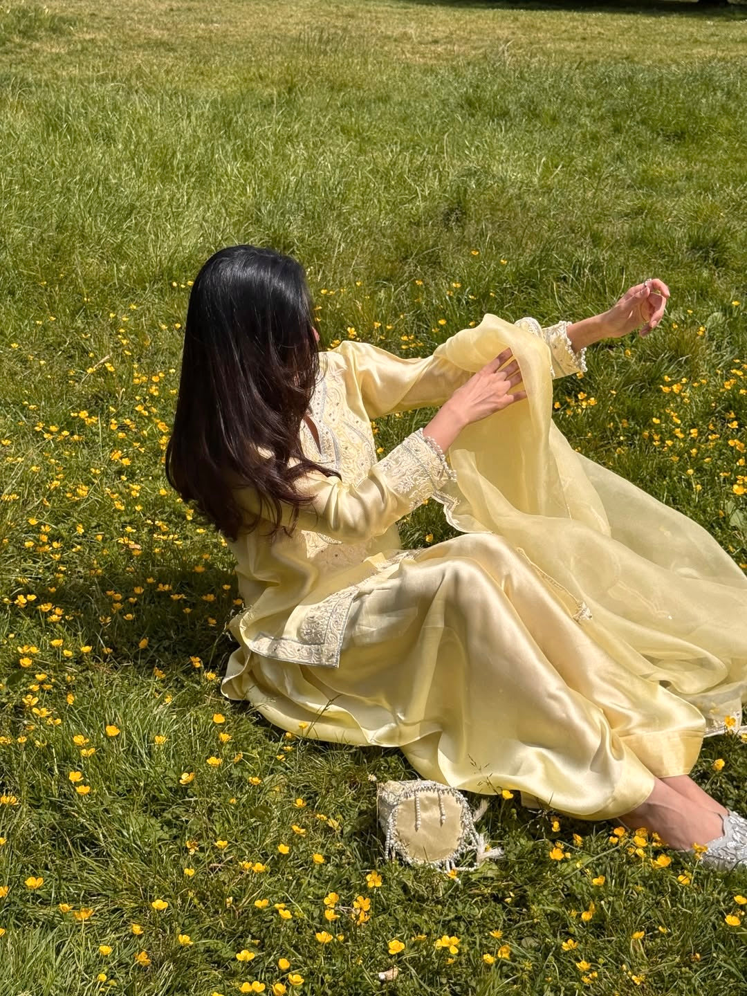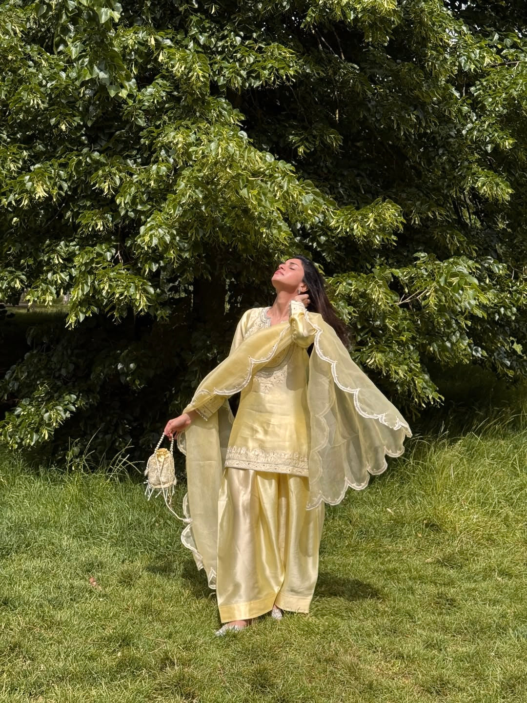 Pastel Yellow Festive Sharara Suit with Hand Embroidery & Organza Dupatta