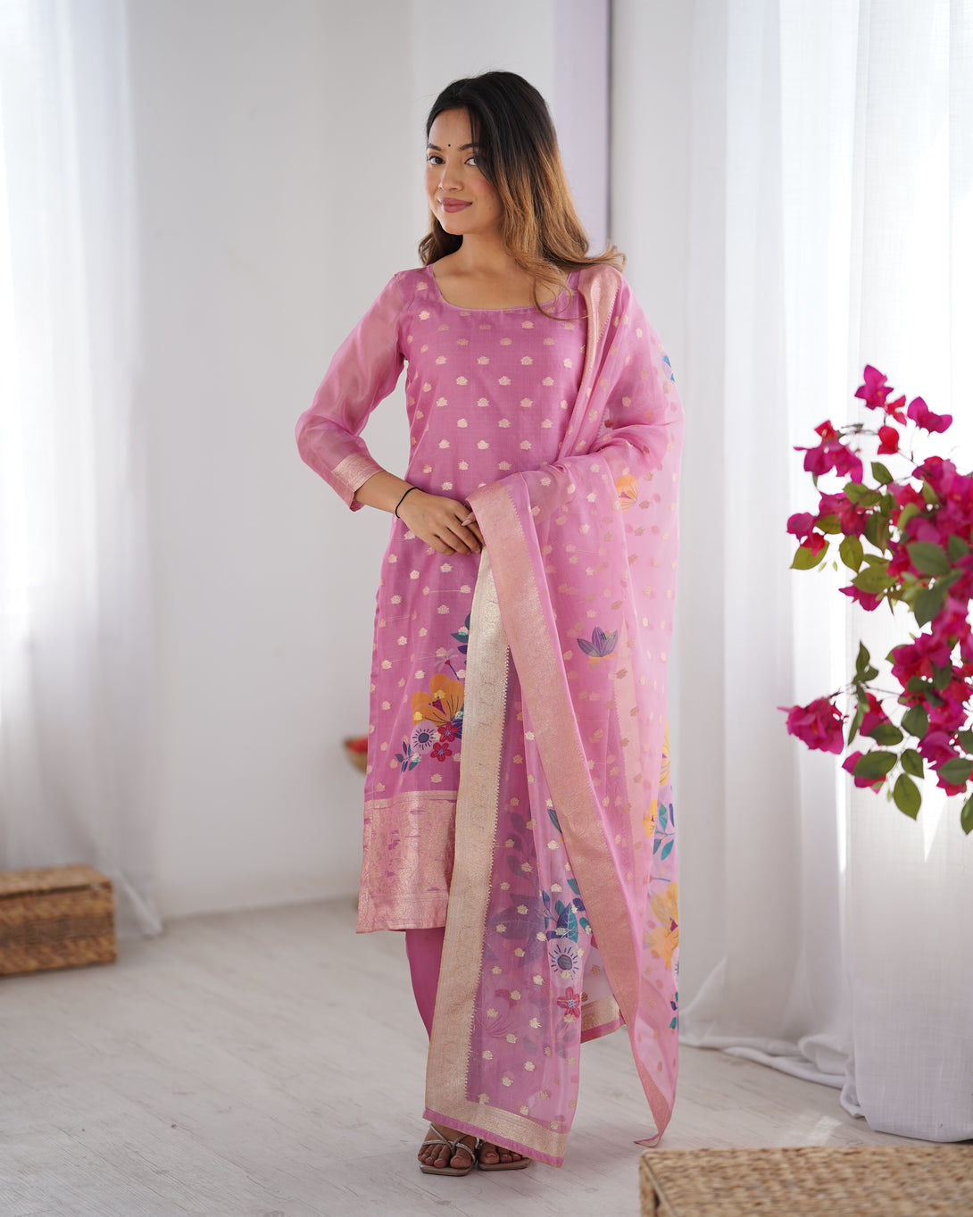 Pink Floral Printed Suit Set with Banarasi Dupatta – Elegant Festive & Daily Ethnic Wear
